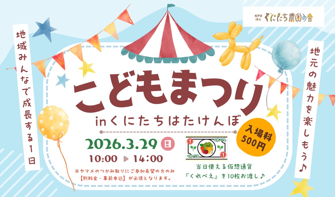 ホーム イベント一覧 イベント一覧 事業名 すべて 認定こども園 かえるの森 放課後クラブニコニコ 農体験プログラム くにたちはたけんぼ 畑の家 みんな畑 ここたまや 国立富士見台団地 風の子 つちのこひろば 谷保のそらっこ フリースペースはたけんぼ 旅するがっこう お蚕フレンズプロジェクト その他 種別 誰でもOK親子子どものみ大人 対象年齢 すべて 高校生以上 未就学児 未就園児親子 年少〜小学生以上の親子 4歳以上のお子さんのいらっしゃる家族 3歳以上のお子さんのいらっしゃる家族 年長〜小学生以上の親子 中学生 年中〜小学生以上の親子 2歳児 小学生未満 小学生 低学年 小学生 高学年 中学生以上 全年齢 開催月 すべて 通年開催 1月 2月 3月 4月 5月 6月 7月 8月 9月 10月 11月 12月 泊まりor日帰り 泊まり日帰り フリーワード 条件クリア イベントの状況一覧受付中締切間近受付終了 受付中 開催日: 2026/2/11(水) やぼたん農園祭2026 食アウトドア生き物リトルホースくにたちはたけんぼ農体験大人 受付中 開催日: 2026/2/11(水) 2/11(祝・水)日帰りスキーin車山高原 自然遊びデイキャンプ子どもの居場所自然体験アウトドア NEW 受付中 開催日: 2026/2/18(水) 2/18(水) はたけんぼサポーターズ 活動日 自然遊び農体験自然体験アウトドアリーブノートレース畑仕事くにたちはたけんぼはたけんぼサポーターズ保護者交流 受付終了 開催日: 全3回 ①2026年2月22日(日) ②5月24日(日) ③8月30日(日) 追加募集!親子で麦畑体験 (全3回) 農体験親子食自然体験畑仕事親子体験会 受付中 開催日: 2026/2/24(火) 2/24(火)くにたち農園の会オンライン事業説明会 にじっこひろばつちのこひろばデイキャンプつちのこや放課後クラブニコニコ畑の家自然体験手しごと倶楽部暮らし旅農体験風の子みんな畑お蚕フレンズプロジェクト不登校大人第三の居場所はたけんぼサポーターズくにたちはたけんぼ子どもの居場所 NEW 受付中 開催日: 2/16(月)、2/26(木) 認定こども園かえるの森 2月オープンデー かえるの森親子子どもの居場所 NEW 受付中 開催日: 毎週月・木・金・土曜日 国立市地域子育て支援事業「つちのこひろば」2月カレンダー 保護者交流親子つちのこひろばつちのこや 受付中 開催日: 通年開催 自然を纏う草木染め2025~秋冬~ 自然遊び畑の家藍染暮らし農体験みんな畑手しごと親子大人自然体験 NEW 受付中 開催日: 全2回:3月8日・6月7日(日) 3/8・6/7(日)親子で育てるじゃがいも体験(全2回) 畑仕事くにたちはたけんぼ農体験親子食自然体験親子体験会アウトドア 受付中 開催日: 1/28・2/4・2/12・2/18・2/25・3/4・3/11 2025年度 2歳児親子遊びの会 「森のひろば」3学期分申込受付開始 かえるの森自然遊び親子 受付中 開催日: 2026/3/14(土) 3/14(土)放課後クラブニコニコデイキャンプ(親子体験会) 子どもの居場所自然体験アウトドア畑仕事第三の居場所くにたちはたけんぼ親子体験会自然遊びデイキャンプ放課後クラブニコニコ 受付中 開催日: 2月14日(土)10:00-12:00 3月19日(木)18:30-20:00 2026年2月14日&3月19日 保育者のための不適切保育防止研修 かえるの森研修 受付中 開催日: 通年開催(月1回~2回)土日 2025年度はっぱひろば 土日開催の自然あそびひろば アウトドアくにたちはたけんぼ自然遊び手しごと子どもの居場所自然体験 受付中 開催日: 通年開催 【2025年度 通年】『おやこひろば』都度(単発)参加 感触あそび手しごと親子自然体験アウトドアくにたちはたけんぼ保護者交流にじっこひろば自然遊び NEW 受付中 開催日: 2026/3/29(日) 3/29(日)こどもまつり くにたちはたけんぼ親子食自然体験アウトドア 受付中 開催日: 木・金曜日を基本に、不定期で実施 認定こども園かえるの森 2歳児一時預かり「だんごむしクラス」 かえるの森自然遊び親子子どもの居場所自然体験 受付中 開催日: 毎週木曜日 ※雨天・祝日休み みんなで畑を耕そう!みんな畑 コミュニティメンバー募集中 大人食畑仕事畑の家暮らし農体験みんな畑 終了済みイベント