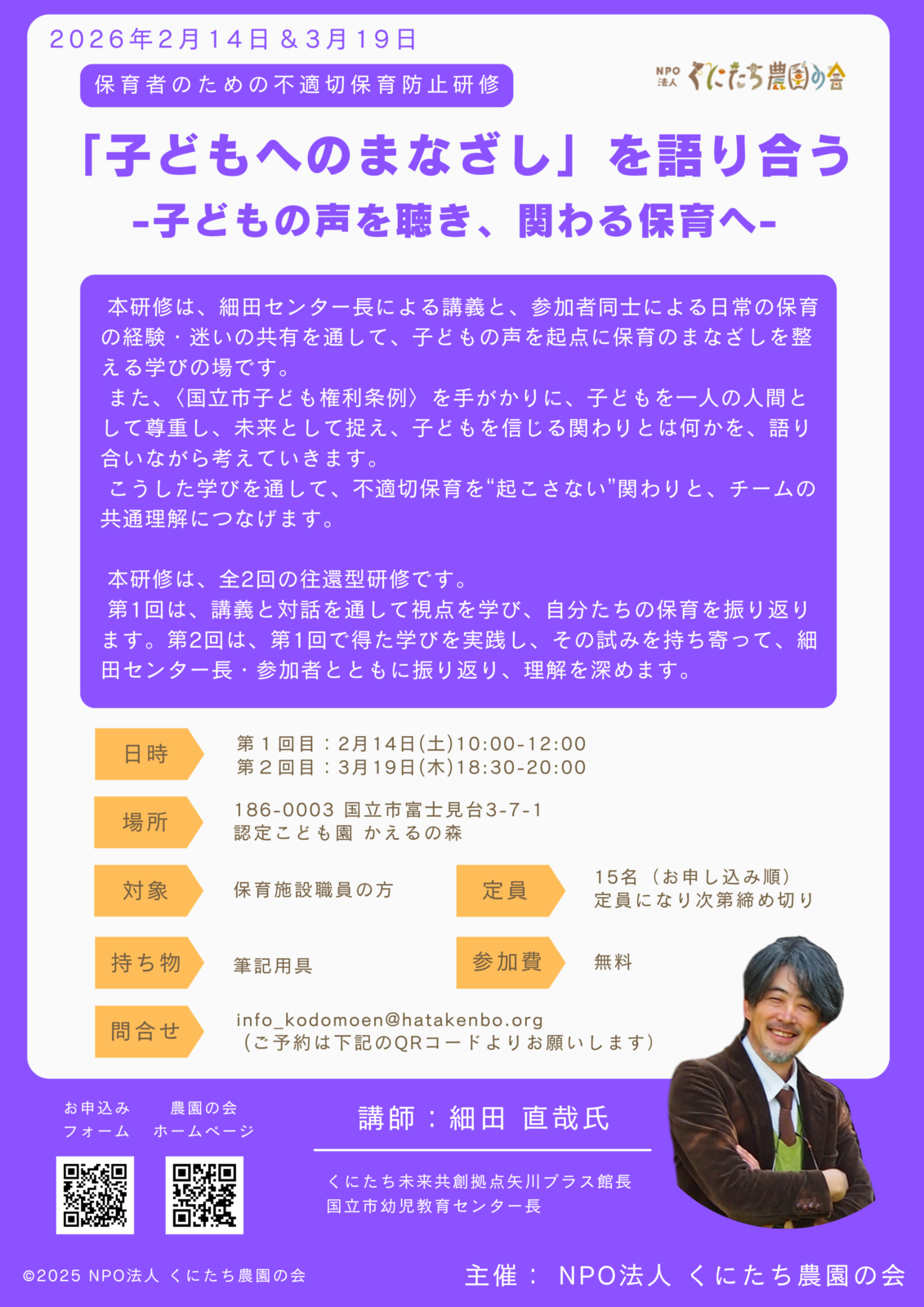 また、〈国立市子ども権利条例〉を手がかりに、子どもを一人の人間として尊重し、未来として捉え、子どもを信じる関わりとは何かを、語り合いながら考えていきます。こうした学びを通して、不適切保育を“起こさない”関わりと、チームの共通理解につなげます。本研修は、全2回の往還型研修です。第1回は、講義と対話を通して視点を学び、自分たちの保育を振り返ります。第2回は、第1回で得た学びを実践し、その試みを持ち寄って、細田センター長・参加者とともに振り返り、理解を深めます。