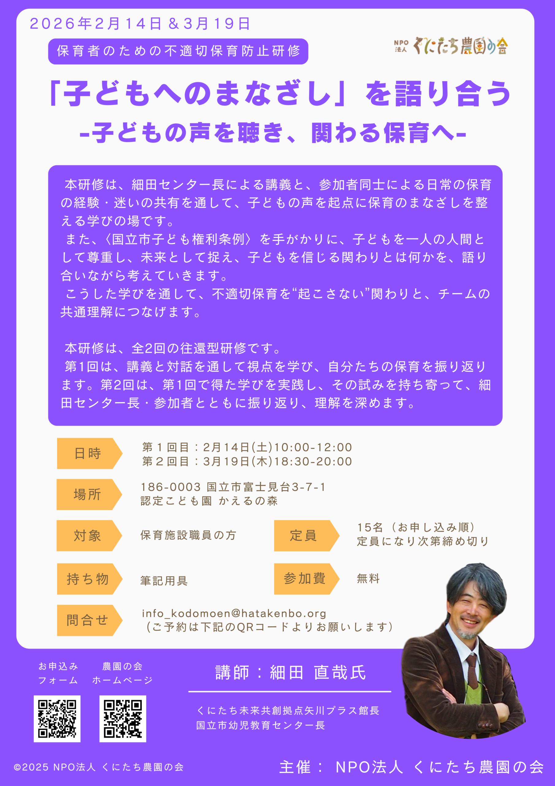 保育者のための不適切保育防止研修 “「子どもへのまなざし」を語り合う”を開催します。<2/14&3/19>@認定こども園 かえるの森