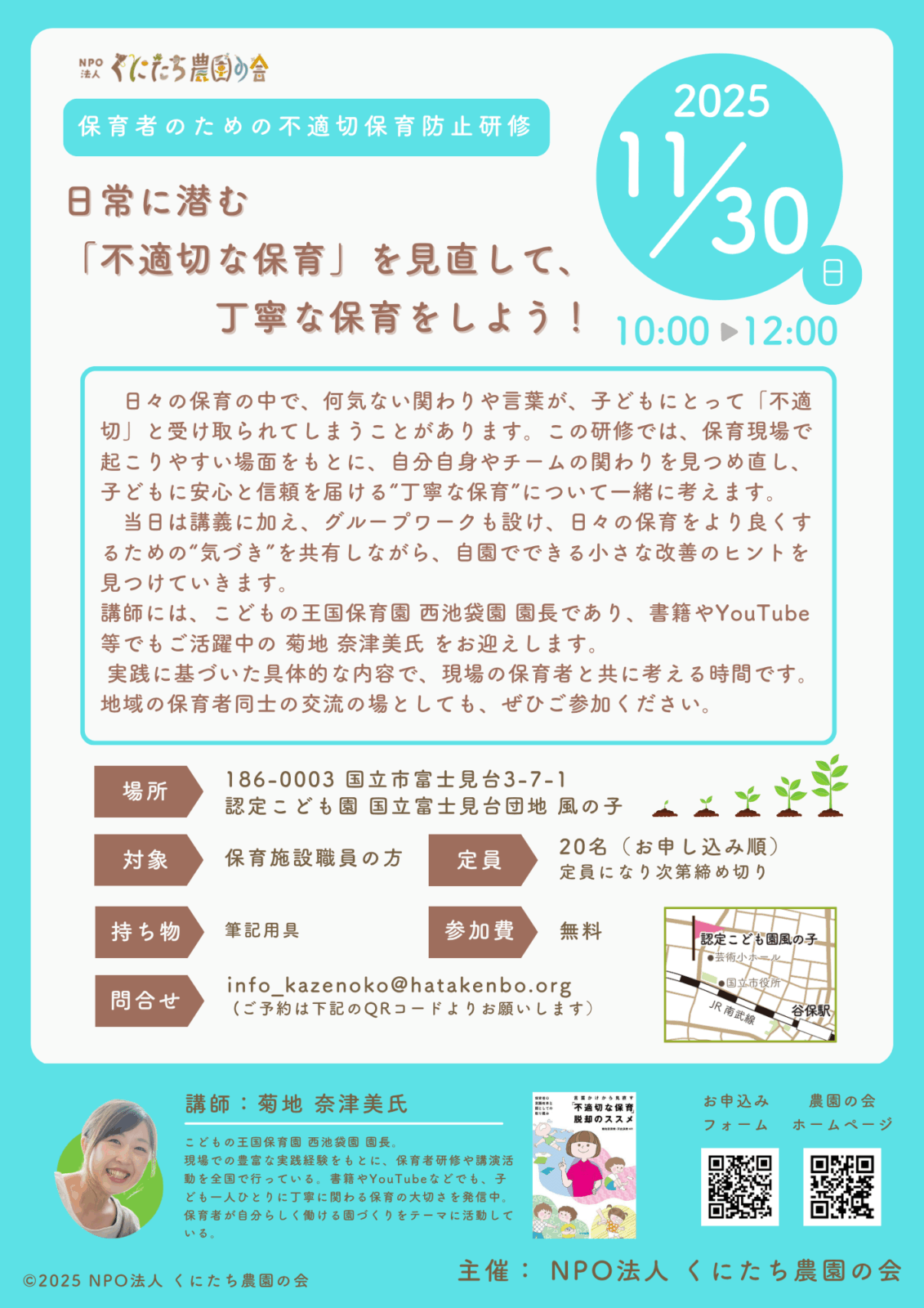 「認定こども園 風の子」にて保育者のための不適切保育防止研修を開催します<2025/11/30(日)>