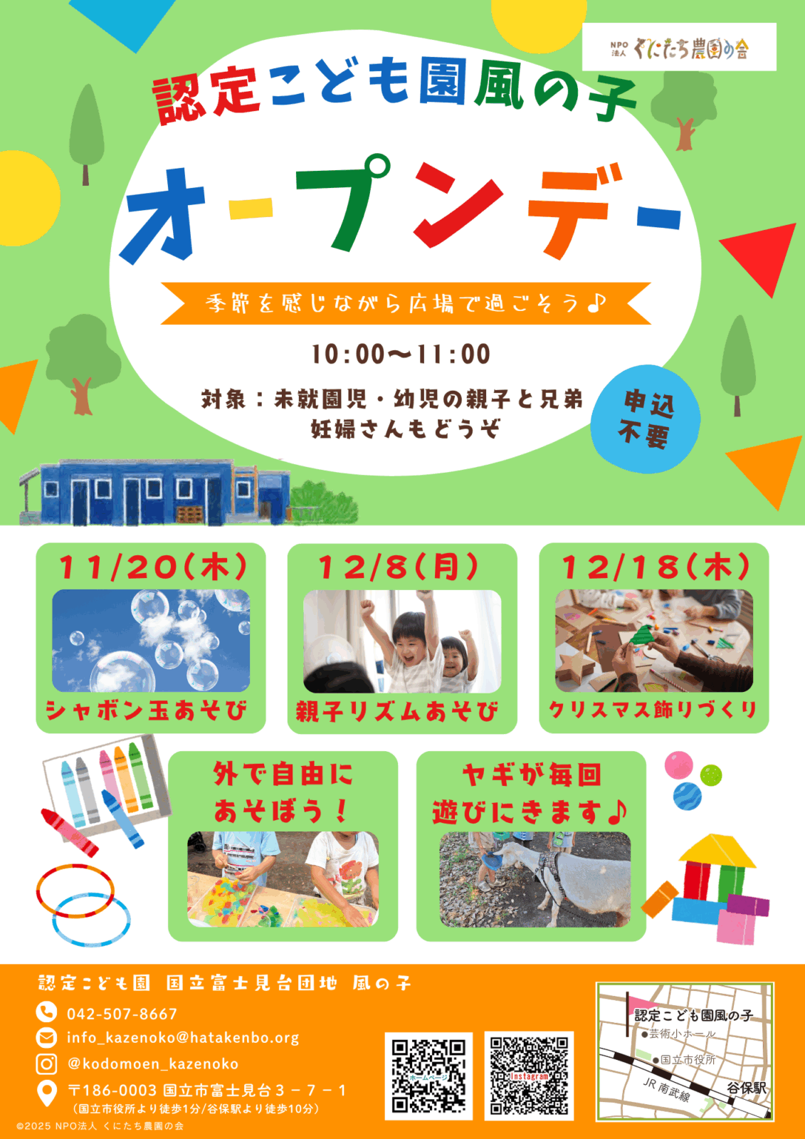 認定こども園 国立富士見台団地 風の子、11-12月のオープンデー(園庭開放)は下記の通り開催します!