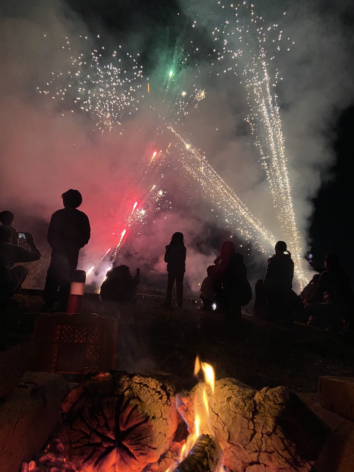 100本以上の国産の打ち上げ花火が満月の冬の田んぼの空に打ち上がりました。子どもたちもそれぞれ手持ち花火を持ってたくさんの笑顔を見る事ができました。寒い中でしたが、温かい味噌汁や焚火を囲いながら実施しました。